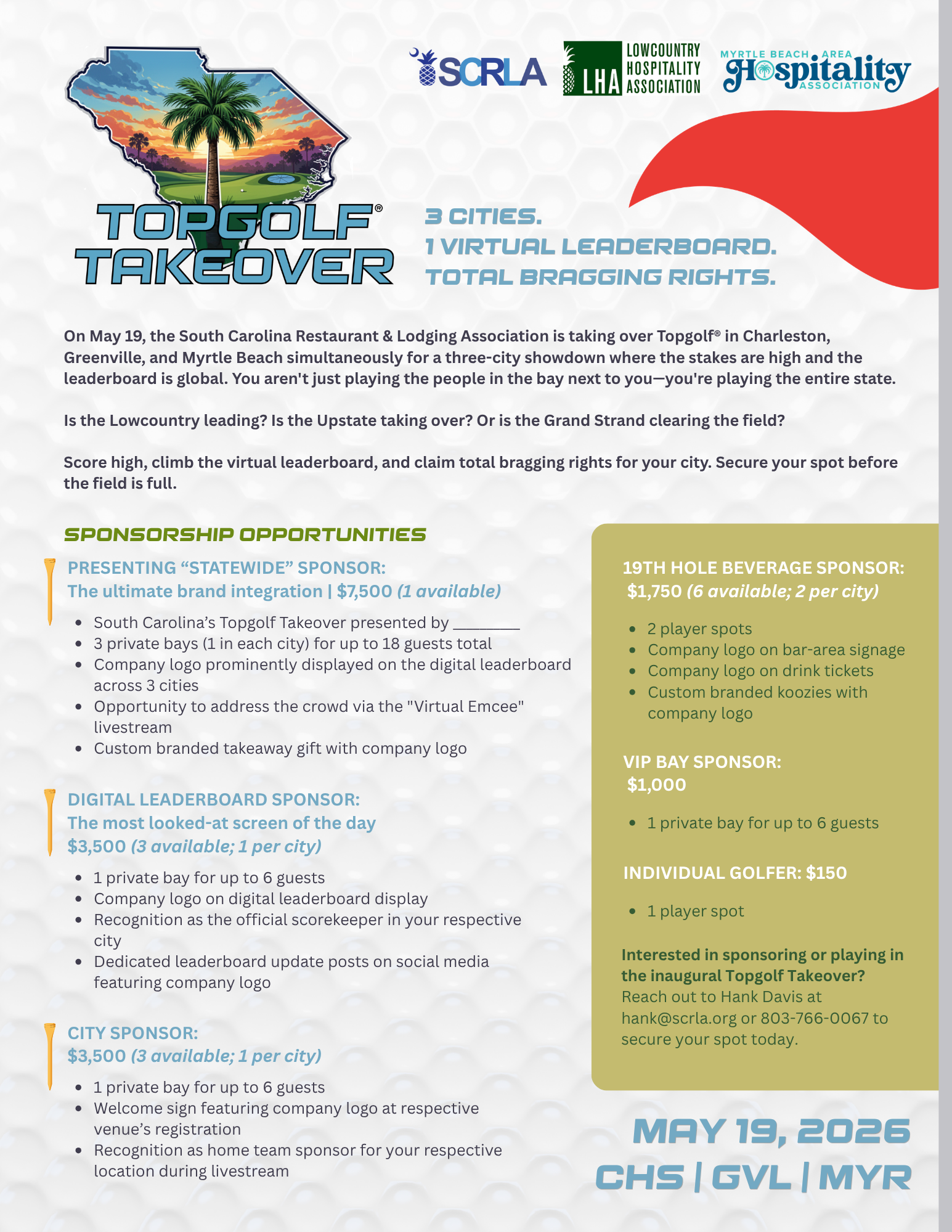 3 Cities. 1 Virtual Leaderboard. Total Bragging Rights. On May 19, the South Carolina Restaurant & Lodging Association is taking over Topgolf in Charleston, Greenville, and Myrtle Beach simultaneously for a three-city showdown where the stakes are high and the leaderboard is global. You aren't just playing the people in the bay next to you—you're playing the entire state. Is the Lowcountry leading? Is the Upstate taking over? Or is the Grand Strand clearing the field? Score high, climb the virtual leaderboard, and claim total bragging rights for your city. Secure your spot before the field is full. Individual player spots begin at $150. VIP bays (up to six players) may be reserved for $1,000.