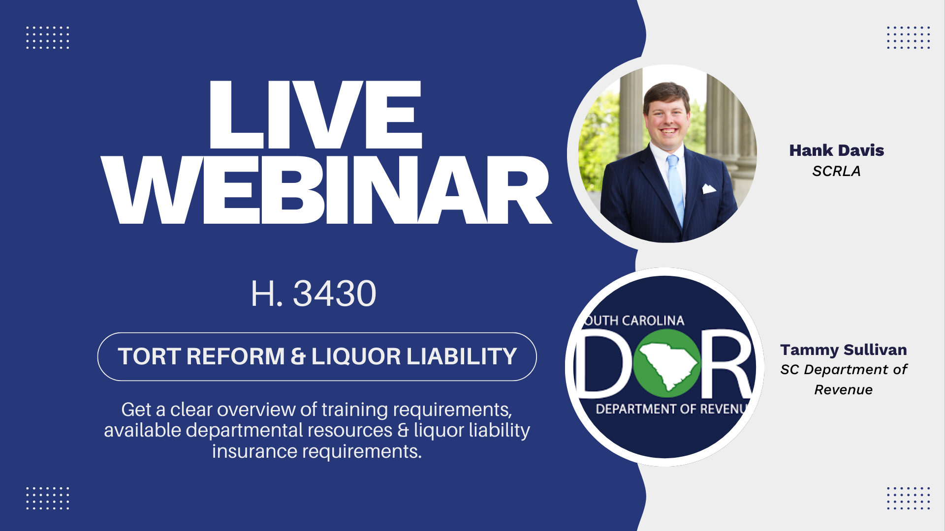 Upcoming Member Webinar: Understanding South Carolina’s New Liquor Liability Law (H. 3430)South Carolina’s new Liquor Liability Law brings important changes that impact hospitality operators across the state. To help you understand what this means for your business, SCRLA is offering a member-exclusive webinar featuring two leading experts. Join Hank Davis, SCRLA’s Vice President of Governmental Affairs, and Tammy Sullivan, Senior Compliance Analyst, with the South Carolina Department of Revenue, for a timely and informative discussion on the new law and its compliance requirements. During this webinar, you’ll gain a clear overview of: - Required training and certification requirements