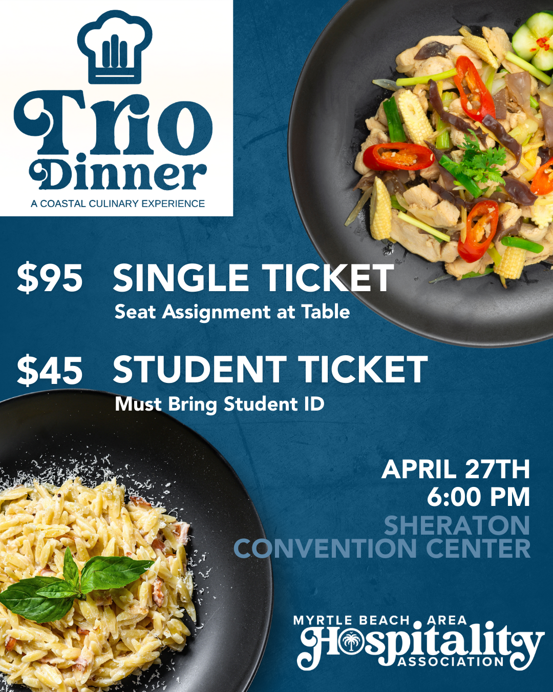 ABOUT TRIO DINNER COASTAL CULINARY EXPERIENCETop local Executive Chefs join with their students to bring you the 17th annual Trio Dinner, A Coastal Culinary Experience. Each trio includes a professional chef, one college student and one high school student creating a unique meal as the culmination of a culinary arts mentorship program. Grand Strand Provisions will provide hors d’oeuvres, and the event includes a cocktail bar, live entertainment and a silent auction. The Trio Dinner is meant to support and promote the culinary arts profession and give students real-world experience. A portion of the proceeds from the event go to the Myrtle Beach Area Hospitality Association’s scholarship funds for hospitality and culinary education.