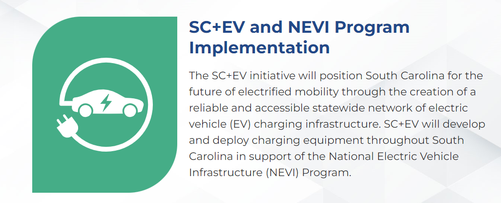 SC+EV is an SCDOT initiative in support of the National Electric Vehicle Infrastructure (NEVI) program. The SC+EV team is working to implement a multi-year, phased approach to develop a convenient, affordable, reliable, and equitable statewide EV charging network. SCDOT will host a one-hour webinar to provide more information to SCRLA members about South Carolina's NEVI Program and EV charging infrastructure site host opportunities on Tuesday, August 6 from 1-2pm ET.