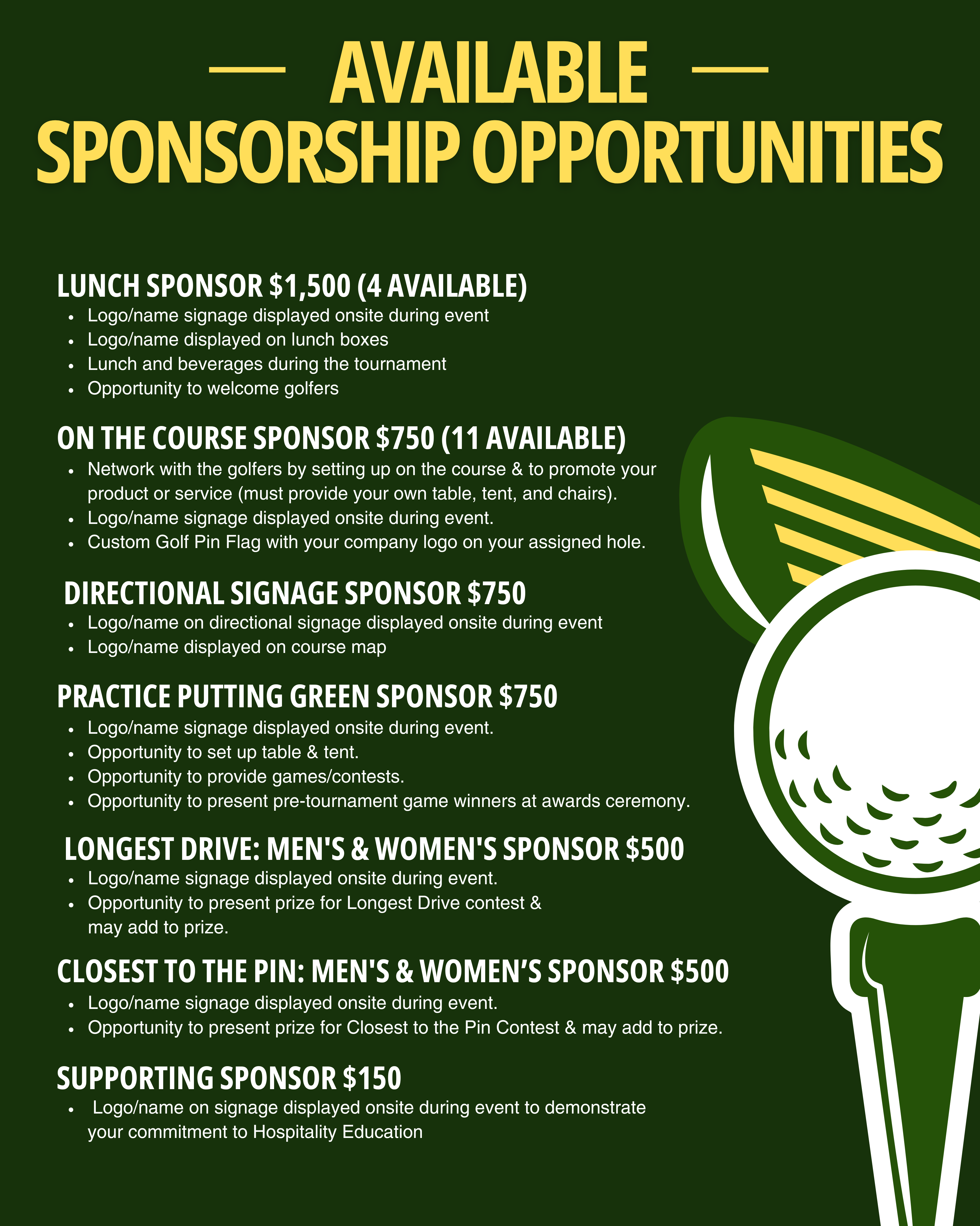 TEAMS ARE NOW SOLD OUT! SPONSORSHIPS STILL AVAILABLE Amid windswept savannahs and centuries-old live oaks lies a course that entwines the ultimate in atmosphere and course design. In the tradition of MacKenzie, Mike Strantz created an extraordinary layout that thrills each and every round. Couple the area’s best golf experience with our well-appointed clubhouse, exciting and expansive member social calendar, and The Ranch, a state-of-the-art golf learning facility, Bulls Bay offers the premier club experience in all the Lowcountry. 9:00 am Registration, Driving Range & Practice Green Open 10:00 am Golf Activities and Games 11:00 am Shotgun Start Format: Bramble (aka Shamble) hybrid golf tournament format where all team members hit a tee shot, the best drive is chosen, and then everyone plays individual stroke play from that chosen spot to hole out Awards Reception immediately following play. This friendly competition is a great opportunity to have some fun on the greens, network and raise money for students seeking careers in the hospitality industry. All proceeds from the golf tournament benefit the South Carolina Restaurant and Lodging Foundation, a 501(c)(3) charitable organization for the sole purpose of advancing hospitality education. Hotel Information Courtyard Marriott Mt Pleasant - 10.2 Miles - 19 mins to bulls bay $120 + tax - king bed or two queens Book your group rate for Golfing at Bulls Bay DoubleTree Mt. Pleasant - 11.1 miles - 21 mins to bulls bay $145 + tax https://group.doubletree.com/jireqf