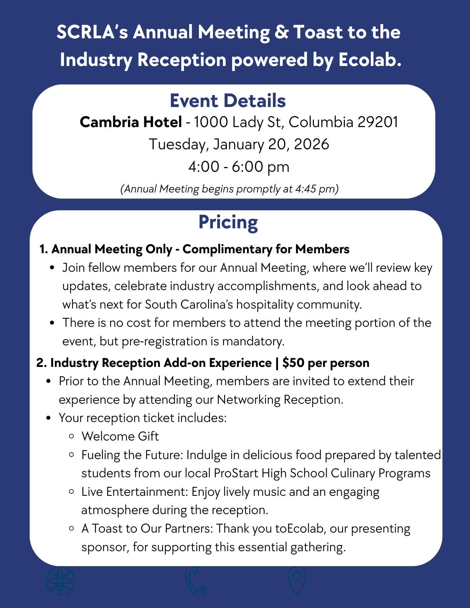 Get ready to kick off the new year by connecting with fellow industry leaders, enjoying exceptional hospitality, and helping shape the future of the South Carolina Restaurant & Lodging Association on January 20, 2026