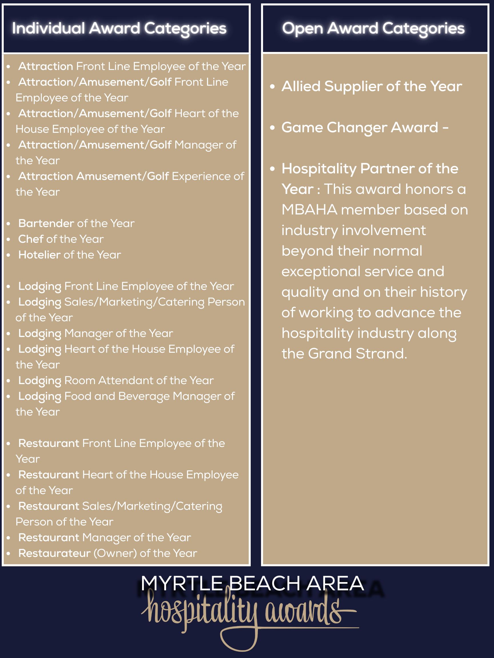 Join the MBAHA for the Hospitality Industry Awards presented by:  This ceremony honors the best of the best in the hospitality industry, in the Myrtle Beach Area The hospitality industry is a driving force of the Grand Strand’s economy, providing jobs and building careers for thousands of people, and playing a vital role in local communities throughout the state. The MBAHA Hospitality Awards celebrate the exceptional professionalism and outstanding service of top individuals in the hospitality industry. These individuals go above and beyond to contribute to the positive image of the hospitality industry while also being confronted with supply and labor shortages. Nominations may be submitted by October 31. Please click here to nominate!
