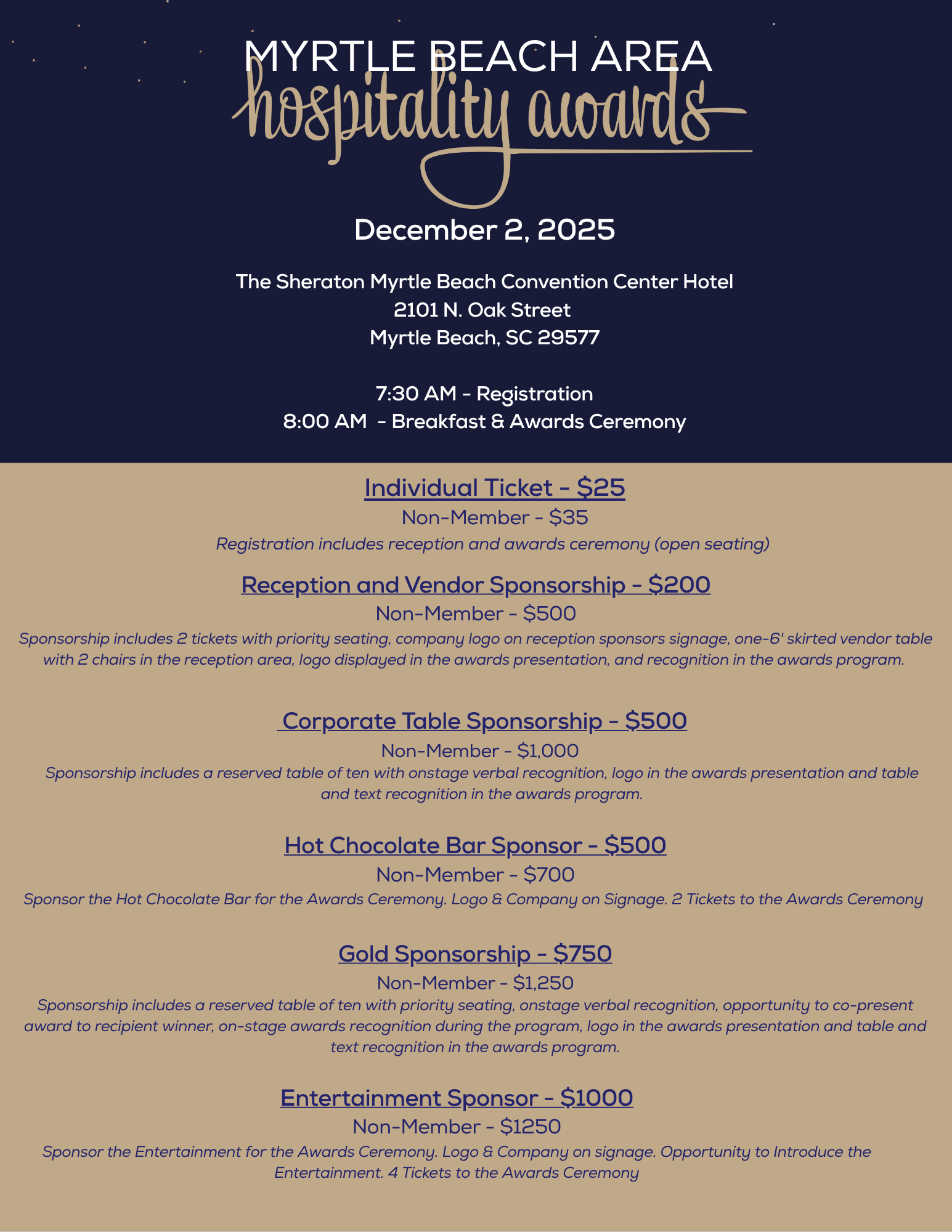 On December 2, 2025, join hoteliers and restaurateurs from the Myrtle Beach Area as we celebrate the spirit of hospitality and honor this year’s award winners.