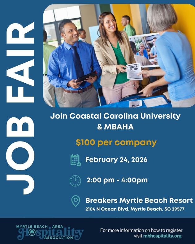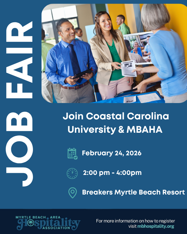 Coast into your career! Join the 2026 MBAHA & CCU Job Fair on February 24th from 2–4 PM at the iconic Breakers Myrtle Beach Resort.