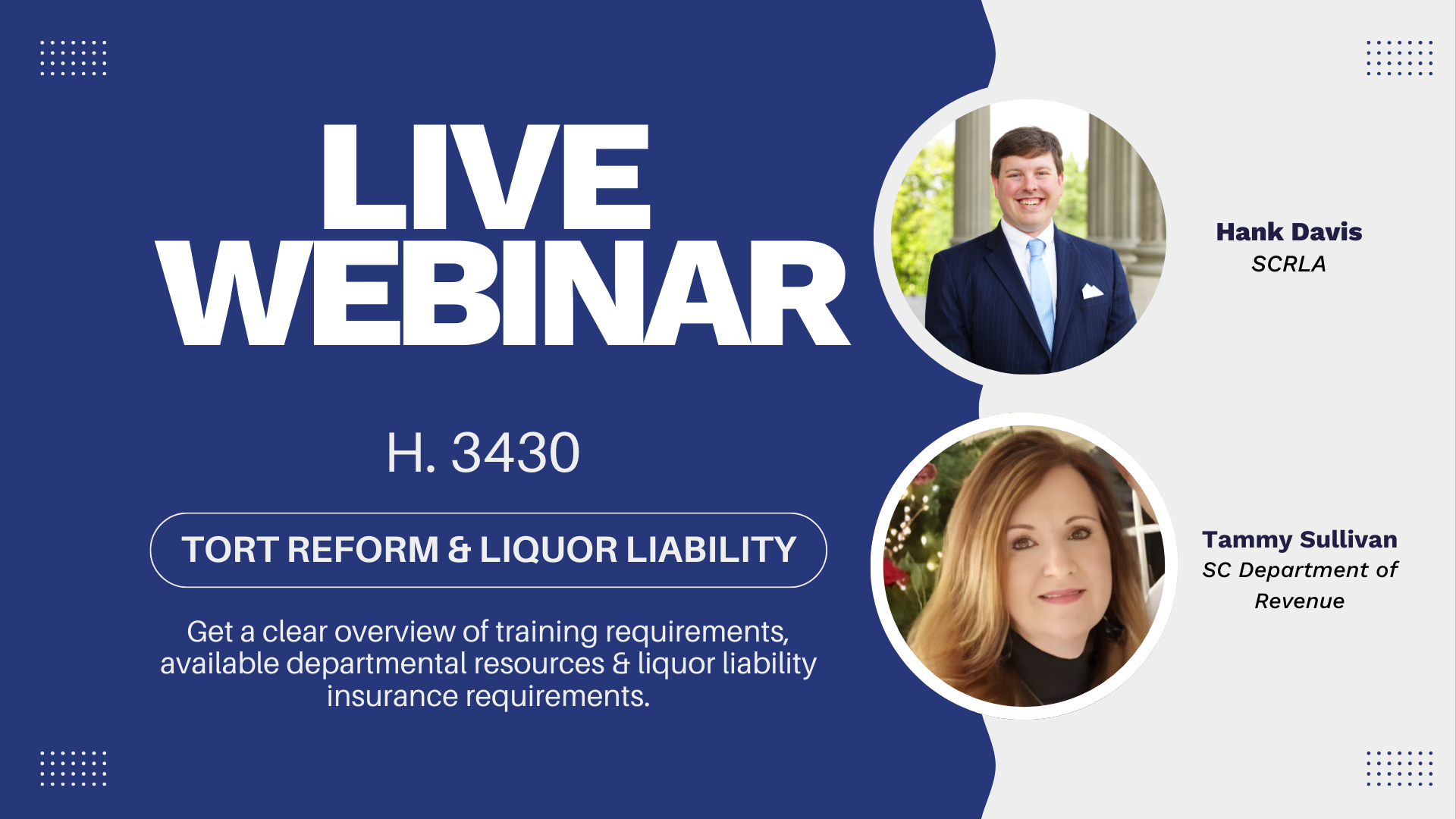 Upcoming Member Webinar: Understanding South Carolina’s New Liquor Liability Law (H. 3430)South Carolina’s new Liquor Liability Law brings important changes that impact hospitality operators across the state. To help you understand what this means for your business, SCRLA is offering a member-exclusive webinar featuring two leading experts. Join Hank Davis, SCRLA’s Vice President of Governmental Affairs, and Tammy Sullivan, Senior Compliance Analyst, with the South Carolina Department of Revenue, for a timely and informative discussion on the new law and its compliance requirements. During this webinar, you’ll gain a clear overview of: - Required training and certification requirements